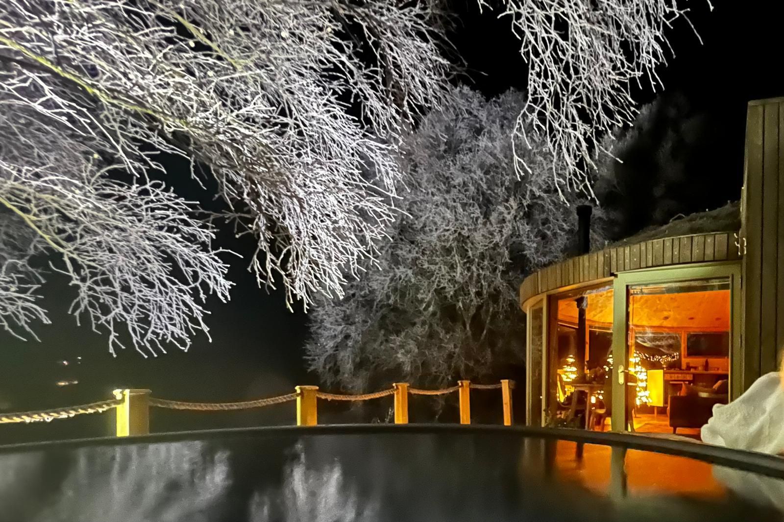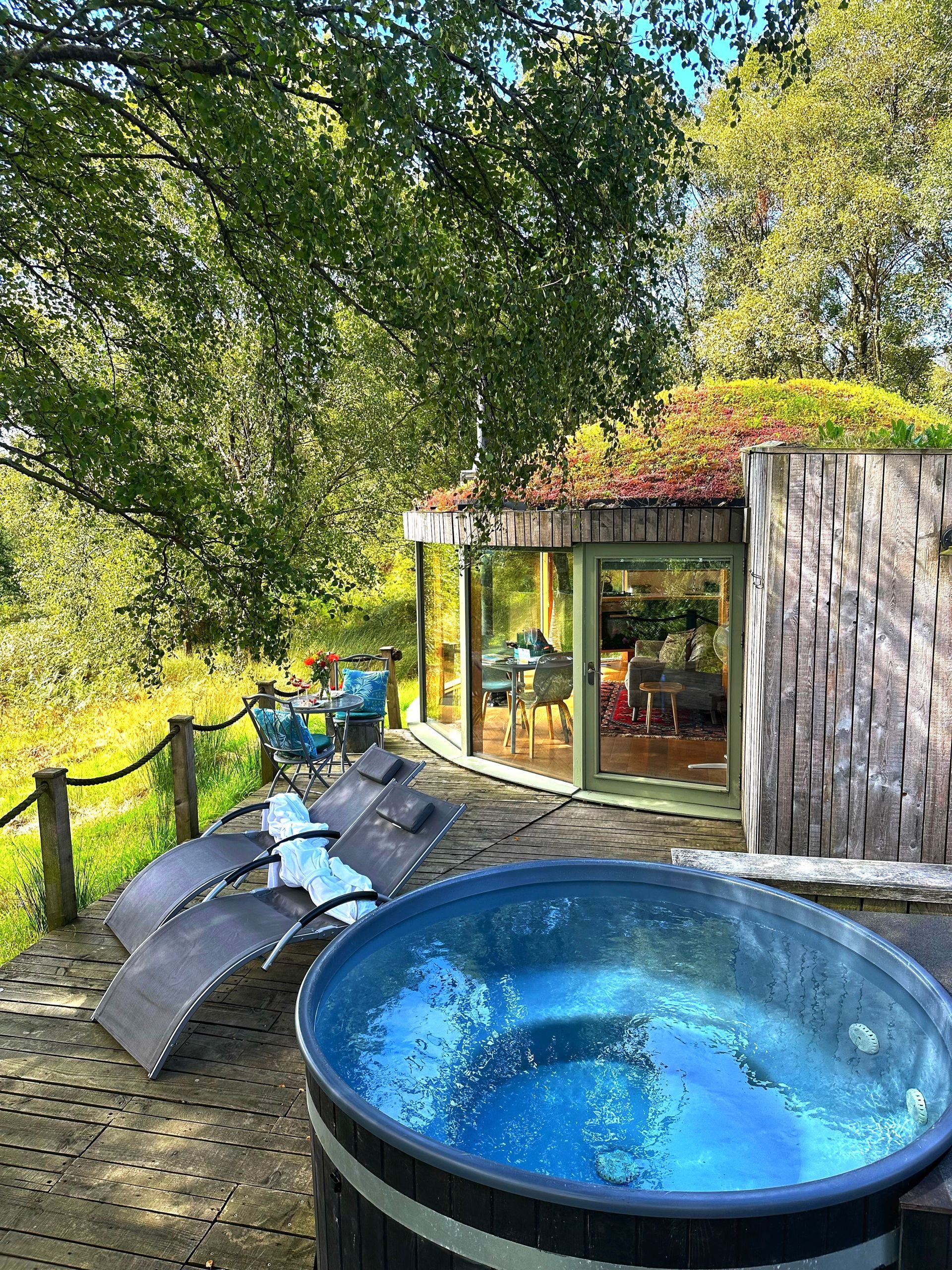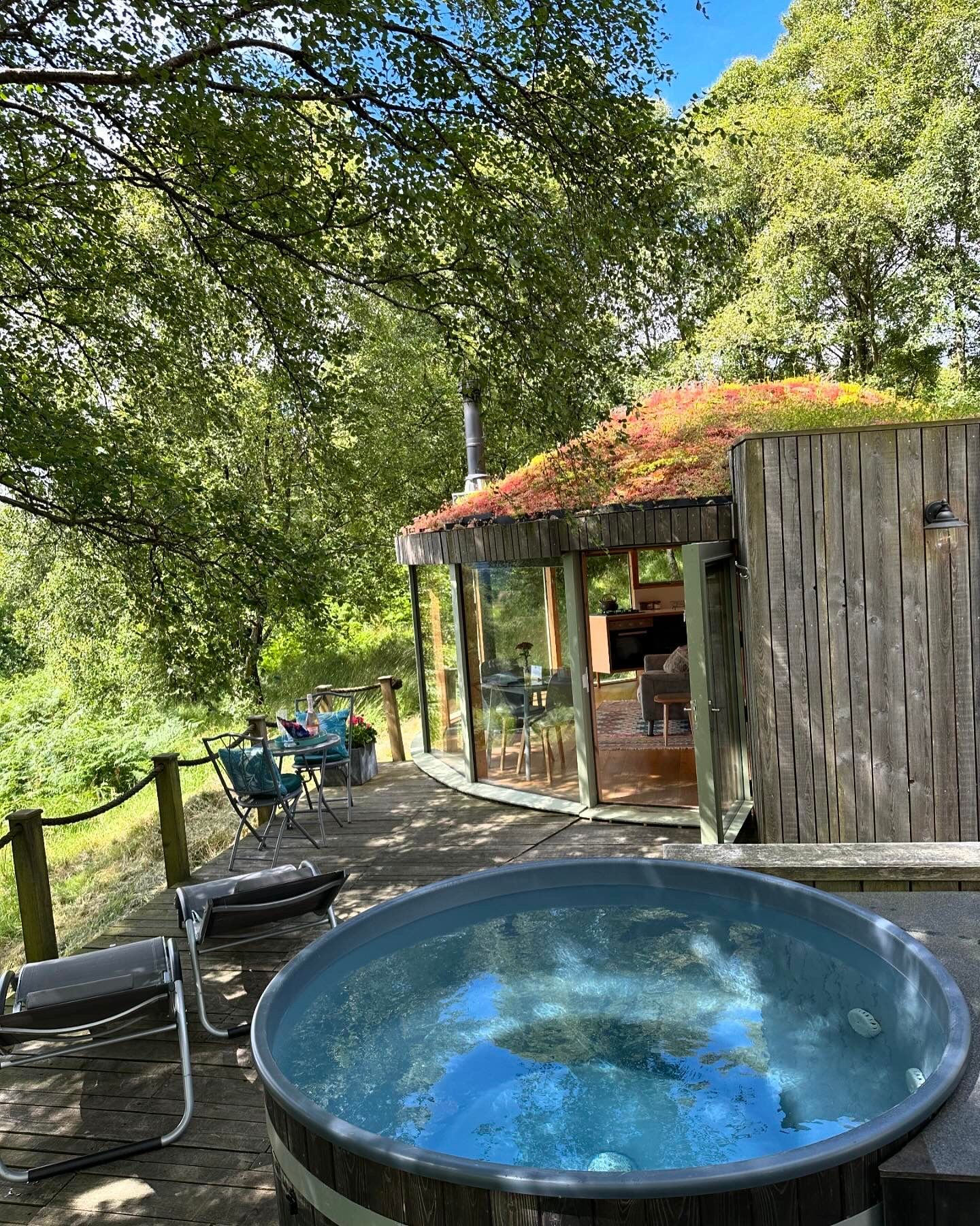 Outside adjoining the Roundhouse there is a deck with a wood fired hot tub, where you can relax and enjoy the views over the Clyde Valley.