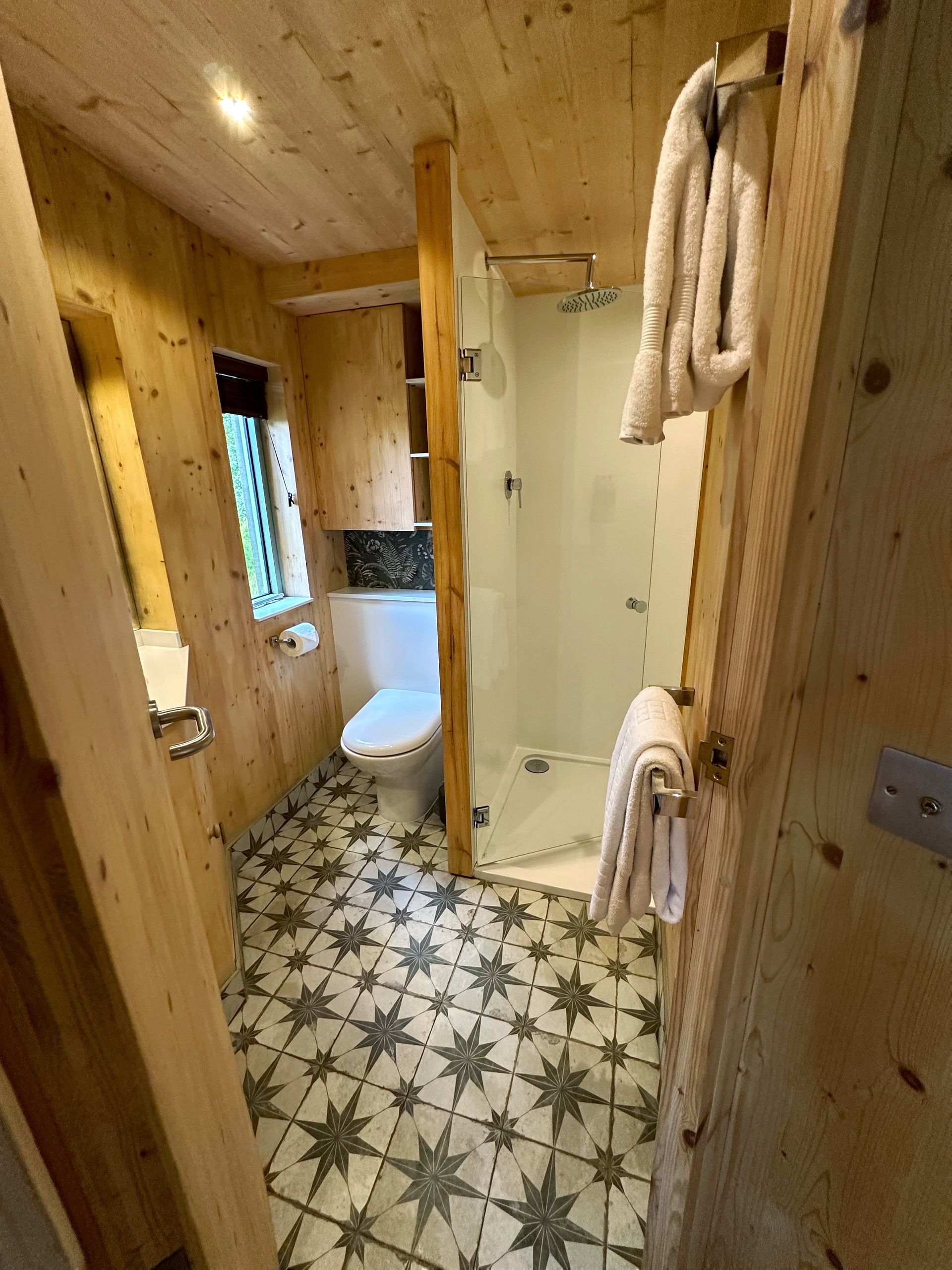 A generous entrance porch in the first of the two extensions, has floor to ceiling storage cupboards, coir flooring, and coat hanging area. The shower room is accommodated in the opposite extension, and is carefully designed to be discreetly accessed from the main space. It has a double shower with a rain head mixer and a toilet with the most wonderful view!