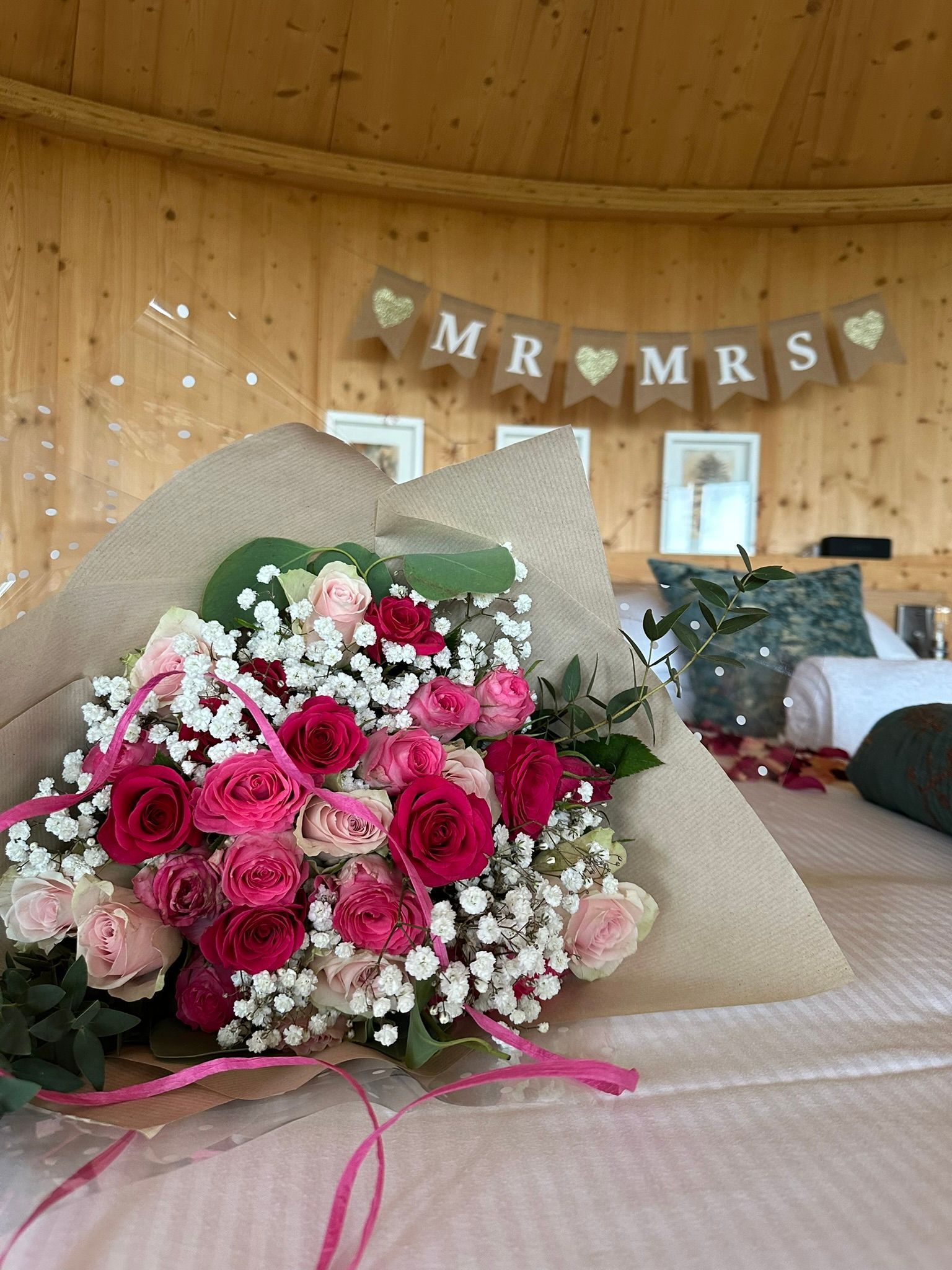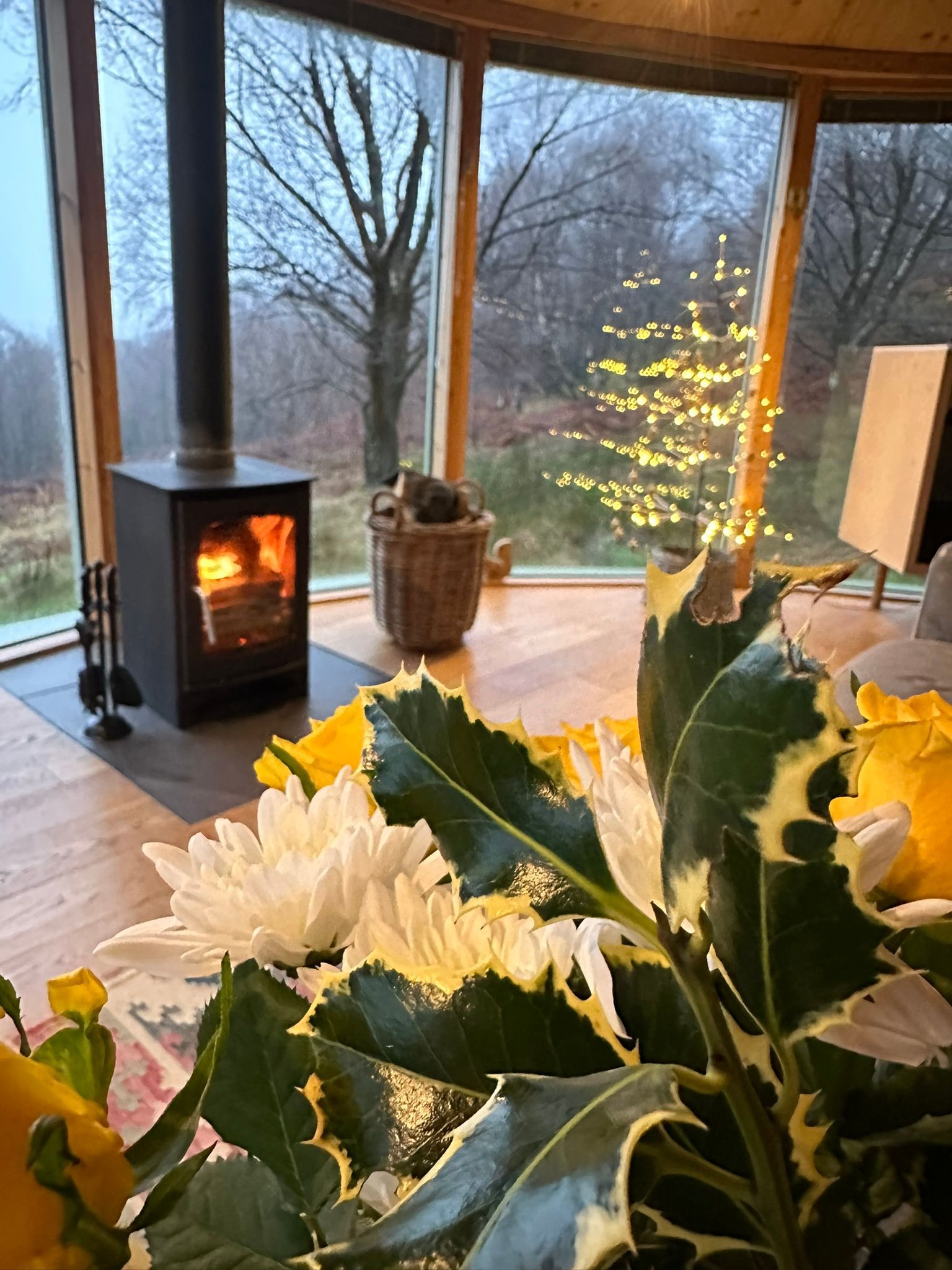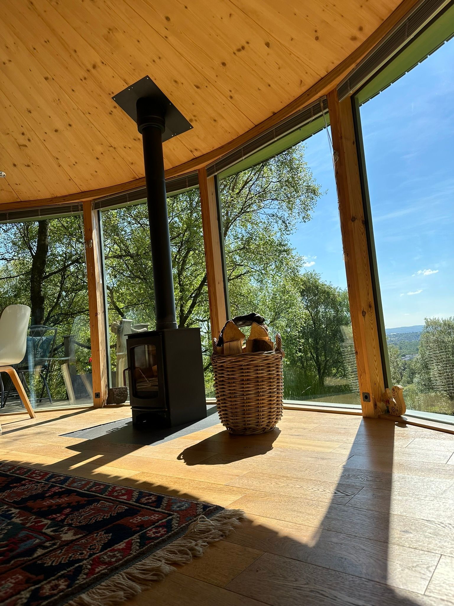 The Roundhouse walls, floor and roof are all highly insulated with sheep’s wool to retain the heat. Small but powerful 12v lights are positioned carefully throughout space, above the kitchen worktop and bedside; power for lighting,12v USB sockets and extractor fans is provided by four solar panels; and cooking appliances use bottled gas.