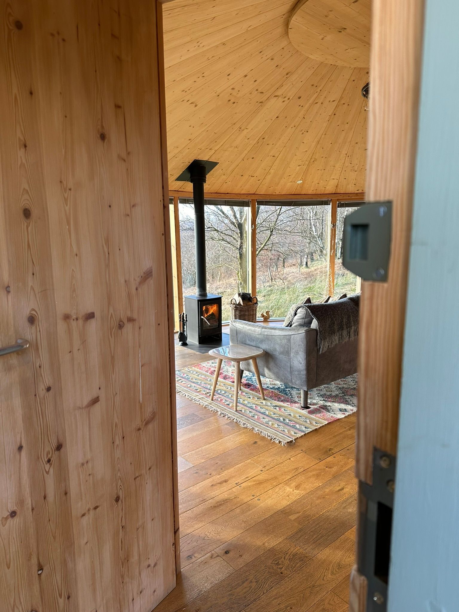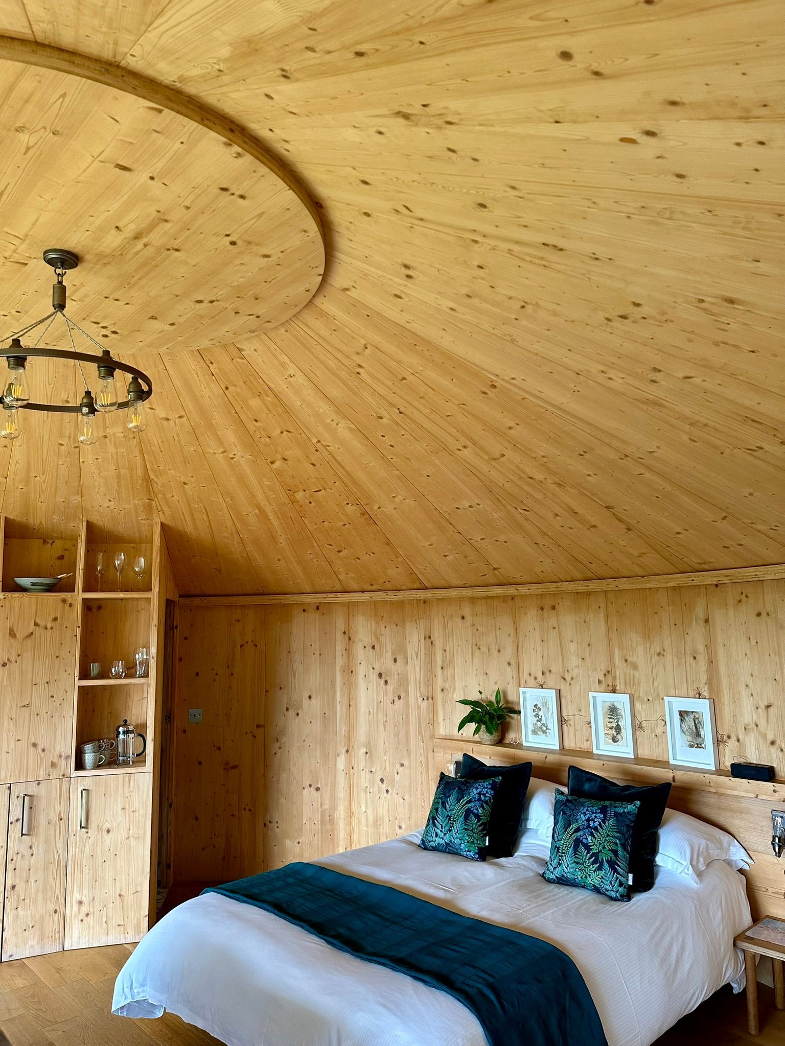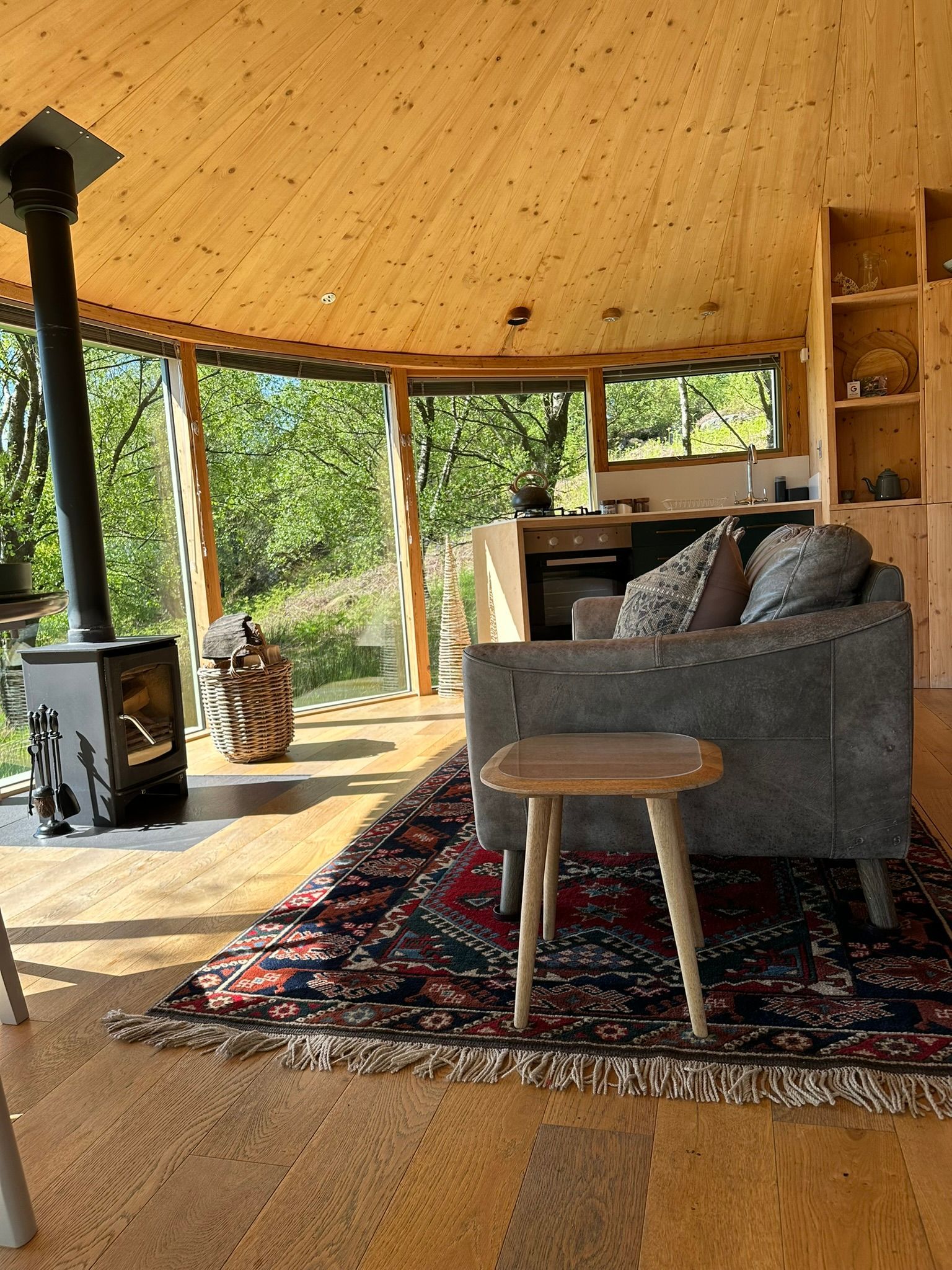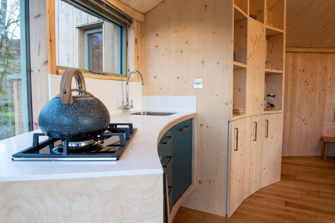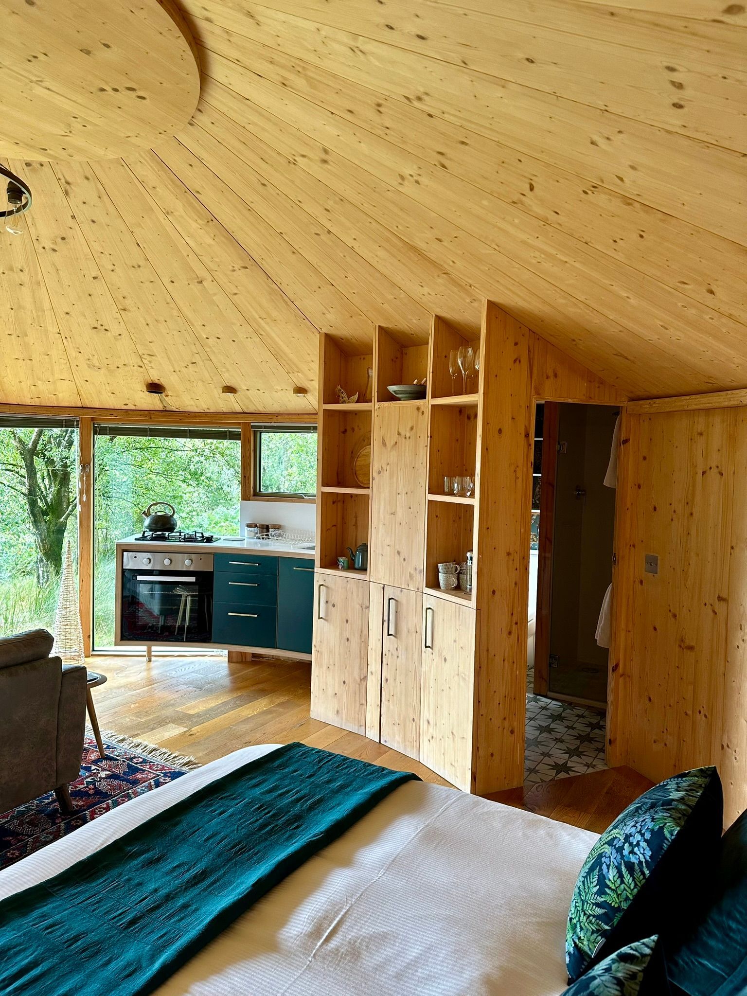 In the main living area against the window there is the wood burner, allowing you to sit around the burner and take in the stunning views, a bespoke kitchenette is to the right of the glazed facade with its own window looking west, this includes a gas oven, a two ring gas hob all cooking utensils and integrated fridge. A king size bed is positioned on the back wall with an oak headboard with reading lights.