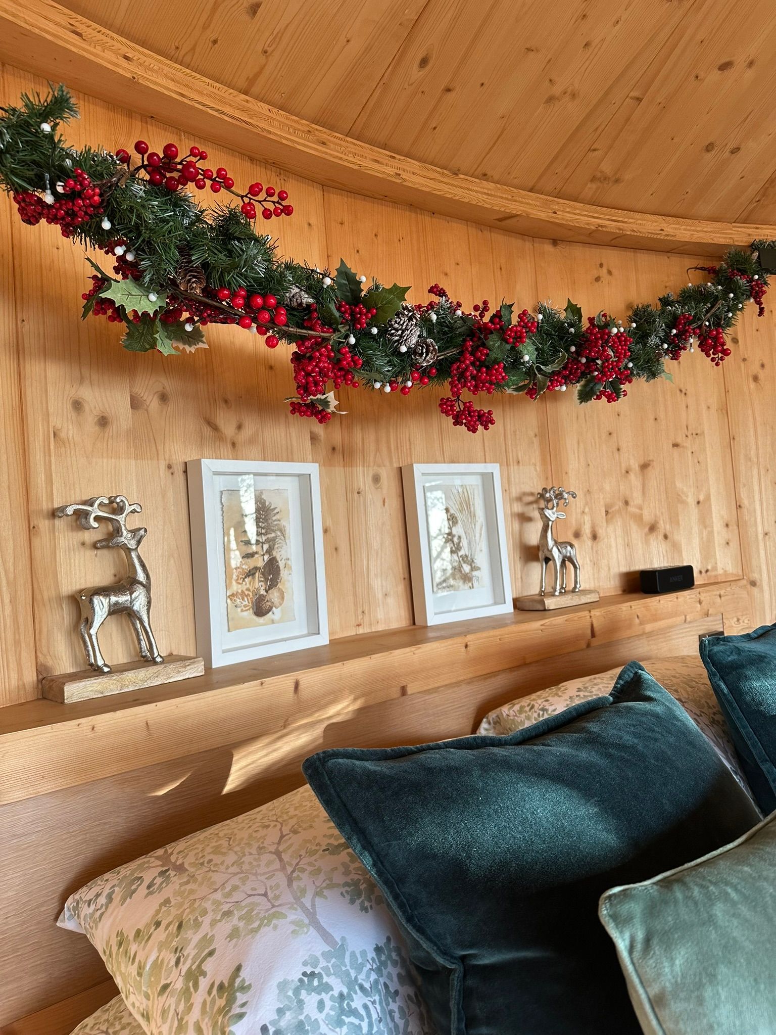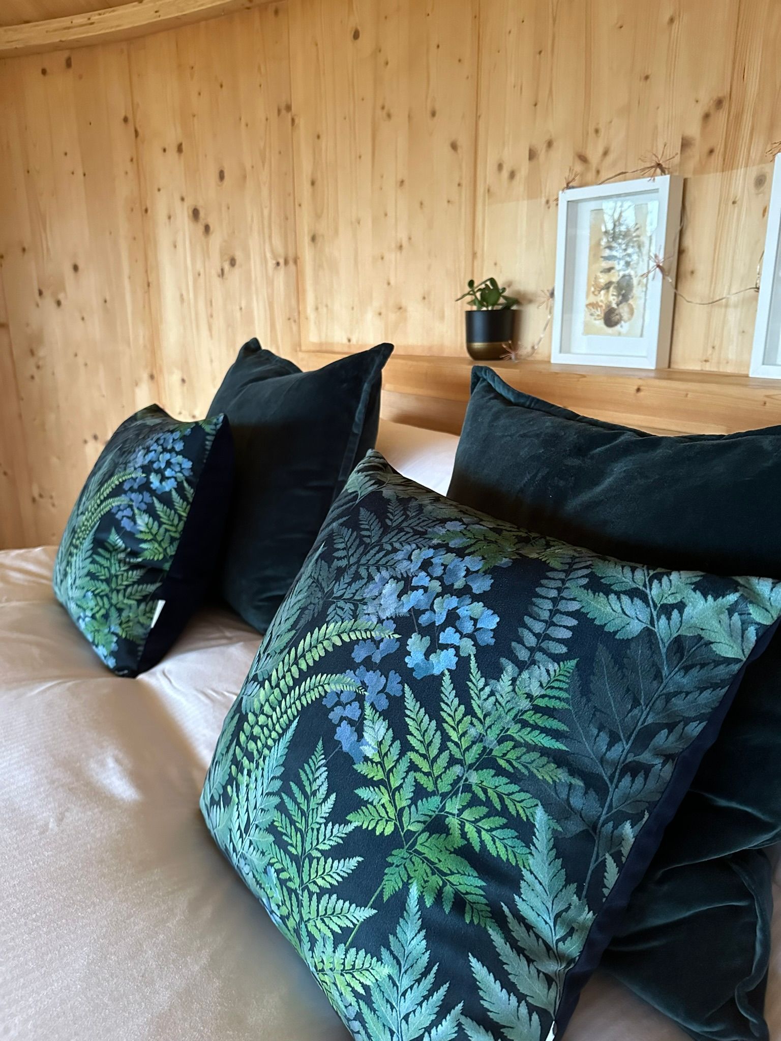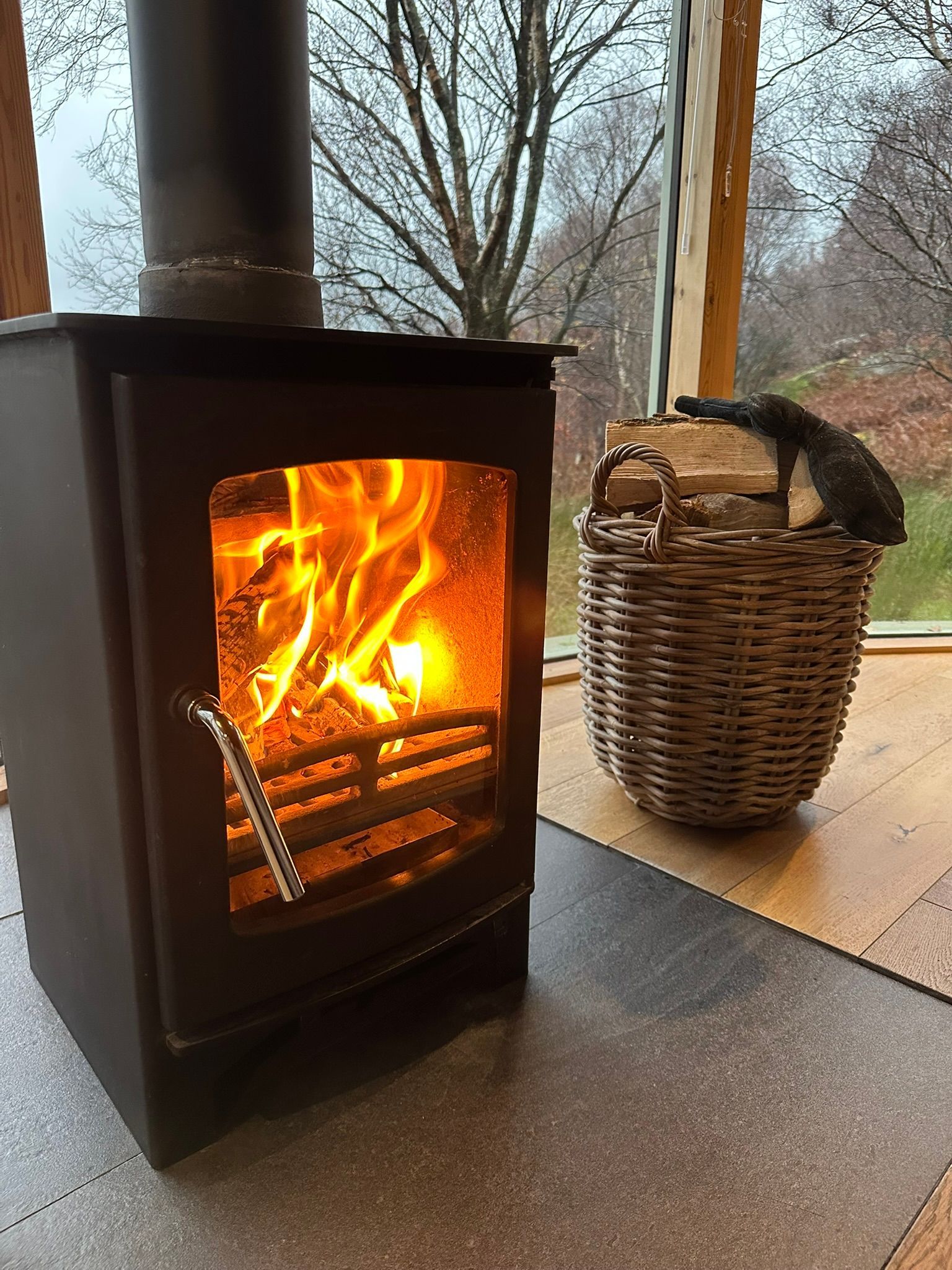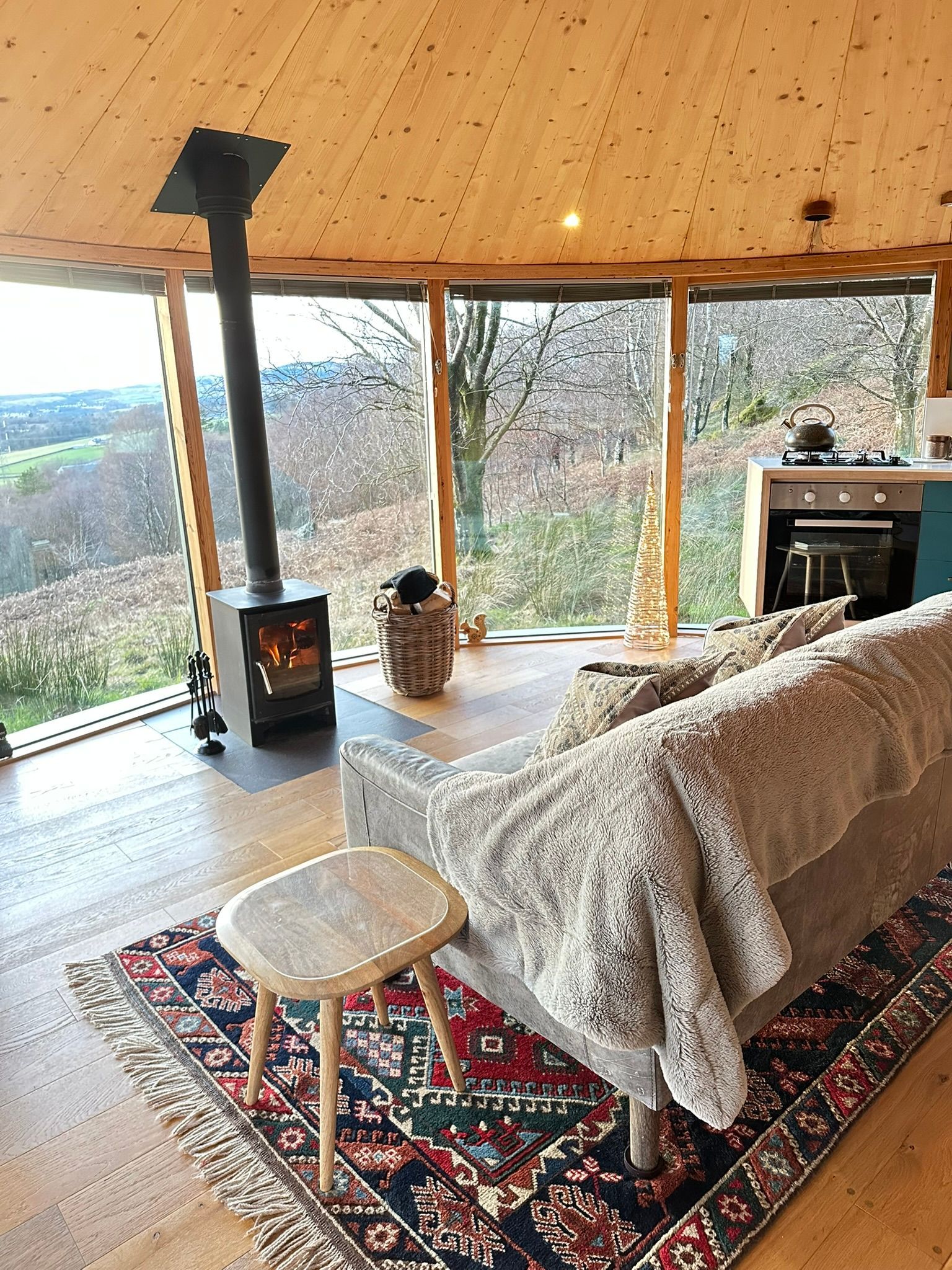 In the main living area against the window there is the wood burner, allowing you to sit around the burner and take in the stunning views, a bespoke kitchenette is to the right of the glazed facade with its own window looking west, this includes a gas oven, a two ring gas hob all cooking utensils and integrated fridge. A king size bed is positioned on the back wall with an oak headboard with reading lights.